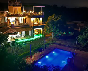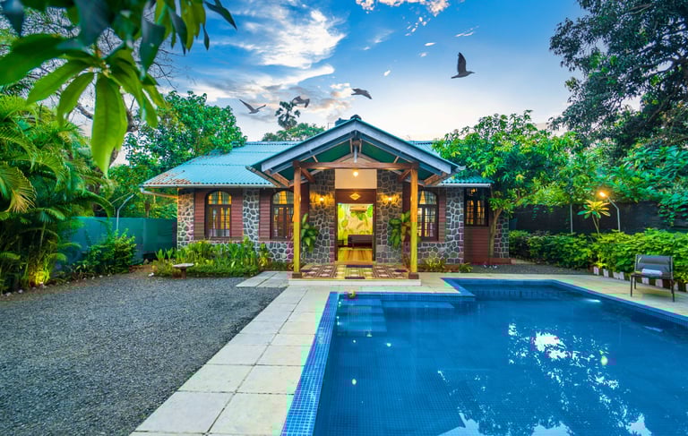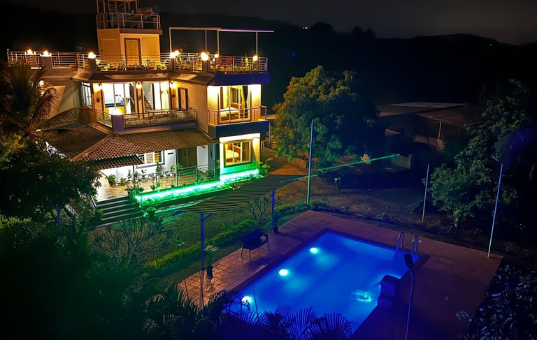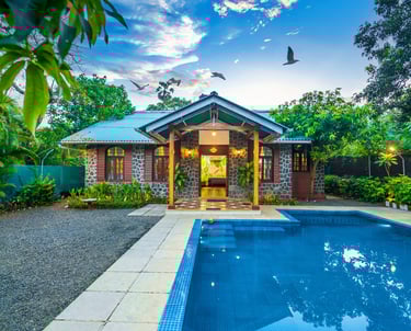 Green Villa Alibag – Your Luxurious Escape Just 12 minutes from Kihim Beach, this spacious 5 BHK villa offers a private pool, lush surroundings, and comfort for over 15 guests. Perfect for family getaways, celebrations, or a relaxing retreat. Book now with Gemstone Hospitality!